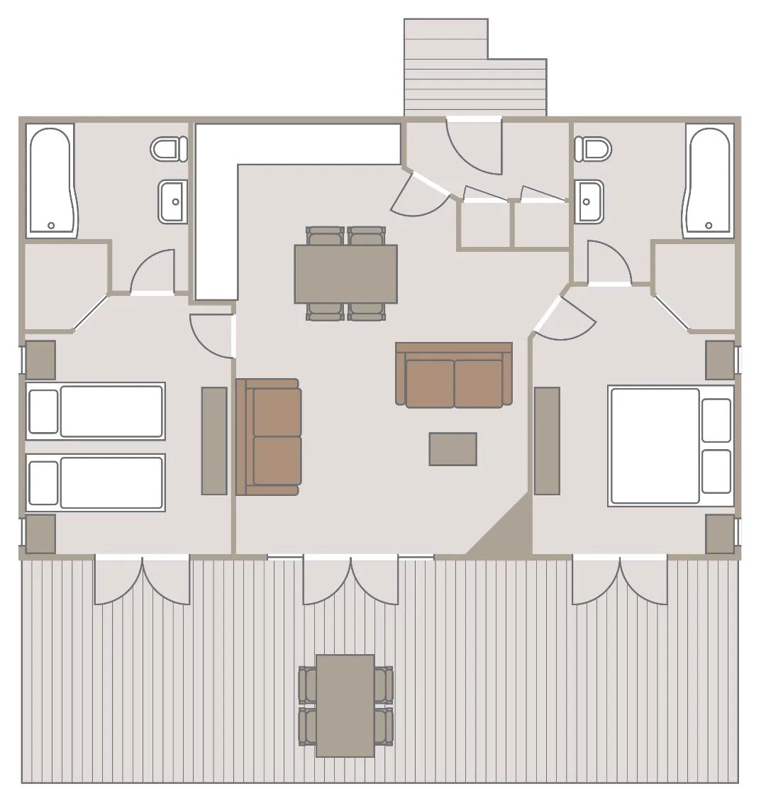 The open plan kitchen and living space, and two en suite bedrooms (one king size and one twin bedroom) are wanting to enjoy a peaceful break in the Yorkshire countryside. Enjoy laid back dining on your own private deck surrounded by woodland.