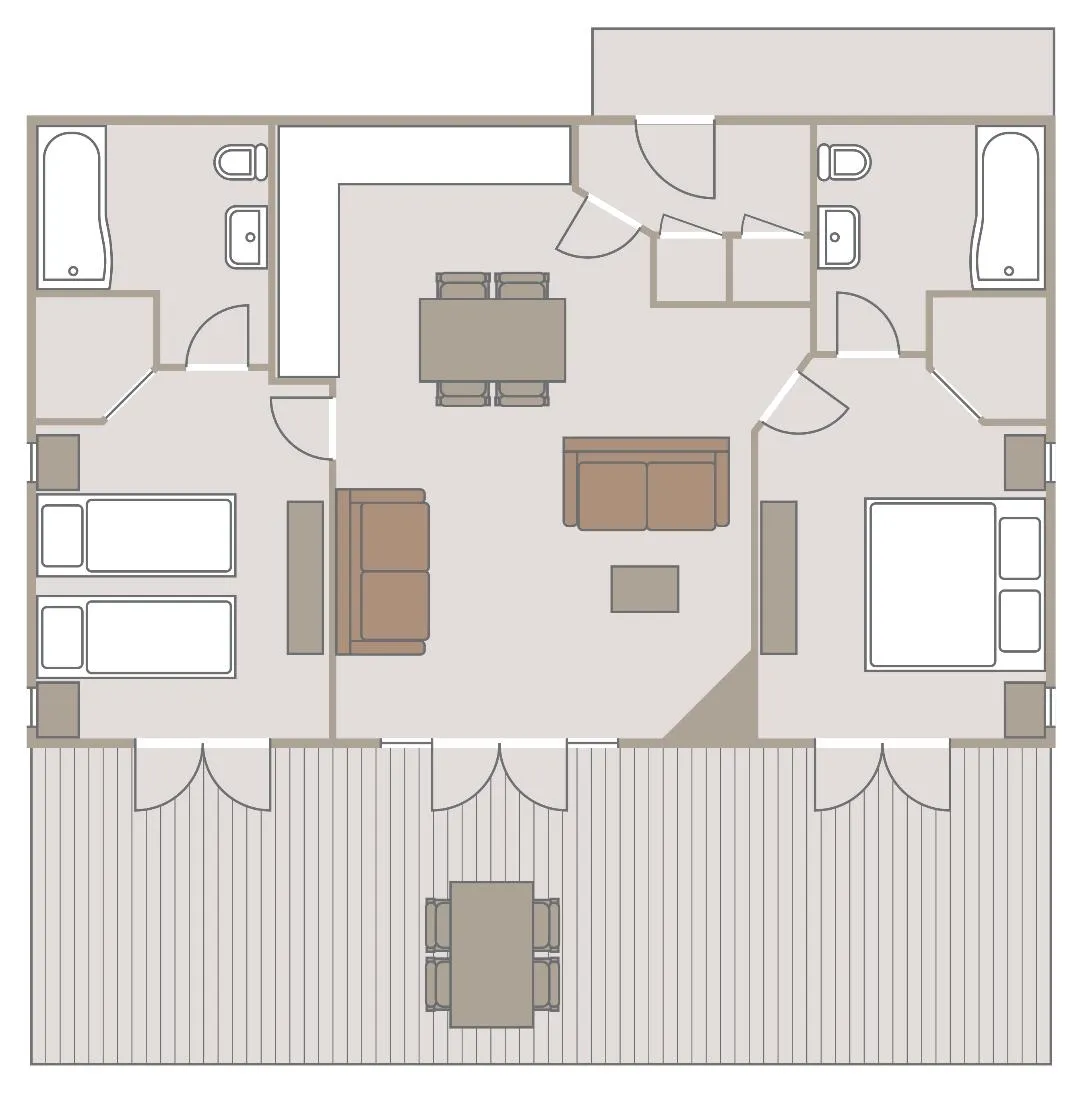 With two spacious en suite bedrooms, Rabbitdale Lodge is great for a family or small group of friends looking for a relaxing getaway. Both bedrooms and the open plan kitchen/living space open onto the peaceful decked area surrounded by trees, and featuring a private hot tub.